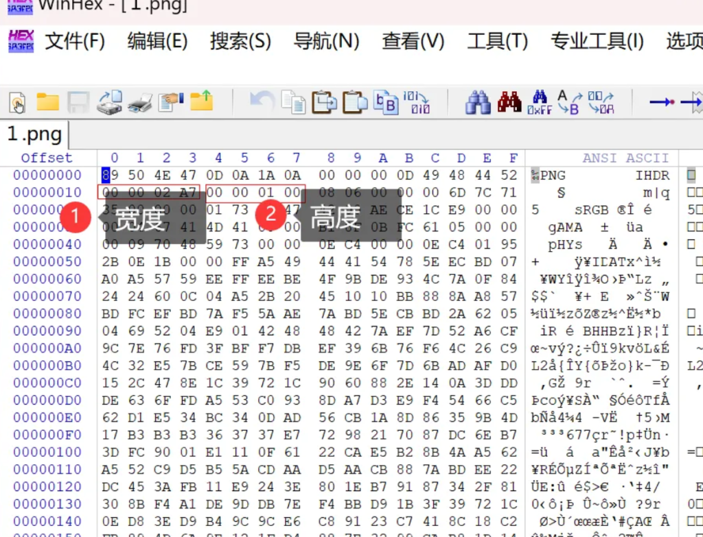 - 在IHDR块起始位置后偏移12字节处,找到宽度的4字节数据,将其修改为目标宽度的十六进制值(大端序)。
