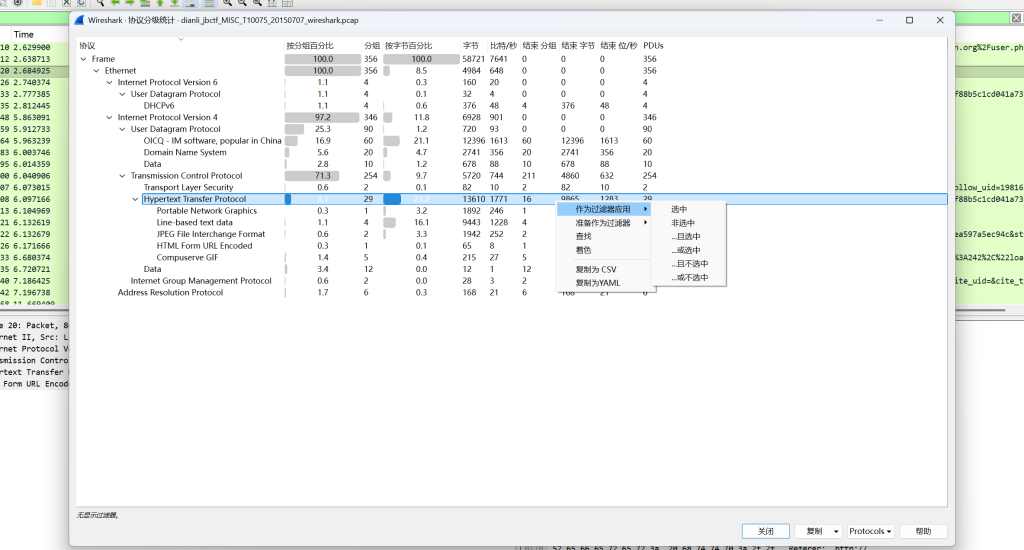 发现应用层HTTP协议占比最高,应该优先分析,优先分析占比最高的。点击右键滑到“作为过滤器应用”点击“选中”,再返回原页面,这样就显示过滤了HTTP协议相关的数据包,可以看见左上方的应用显示过滤器的输入框内容也添加了”http“,现在只有29个数据包了,我们即将开始逐个分析,点击每一个数据包,观察下面的窗口。发现第三个数据包的TCP/IP协议栈解析窗口和数据显示窗口处都出现了flag(password),将其复制,输入。