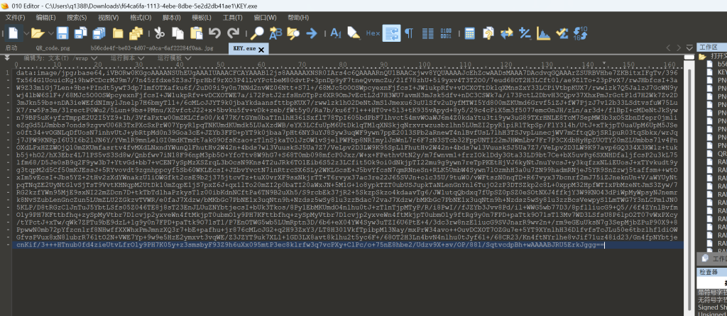 发现这个里面有一长串奇怪的编码,看到编码最后有个=,猜是Base编码
