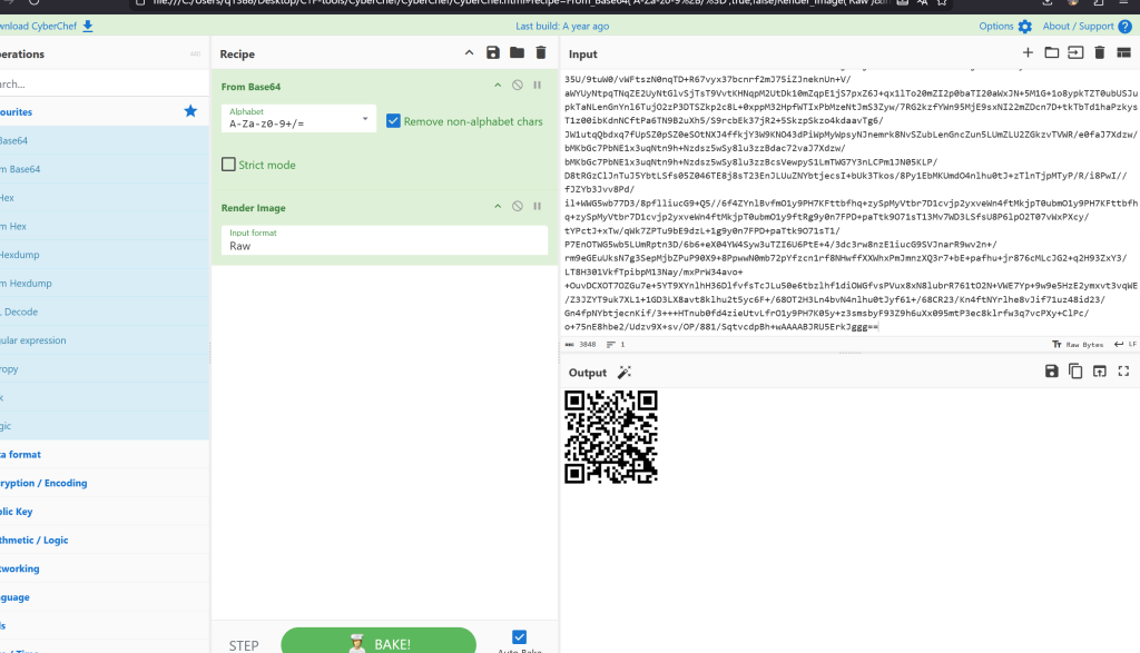 发现明显提示Base64,使用cyberchef解码,出来一个png文件,发现是二维码
