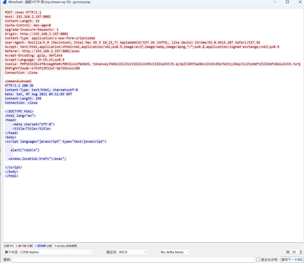 得到id:10086,但是这里值得注意的是,流1、2只是用这个token进行登录前端,从流3来看,攻击者进行whoami的命令,这个token的id没有权限
