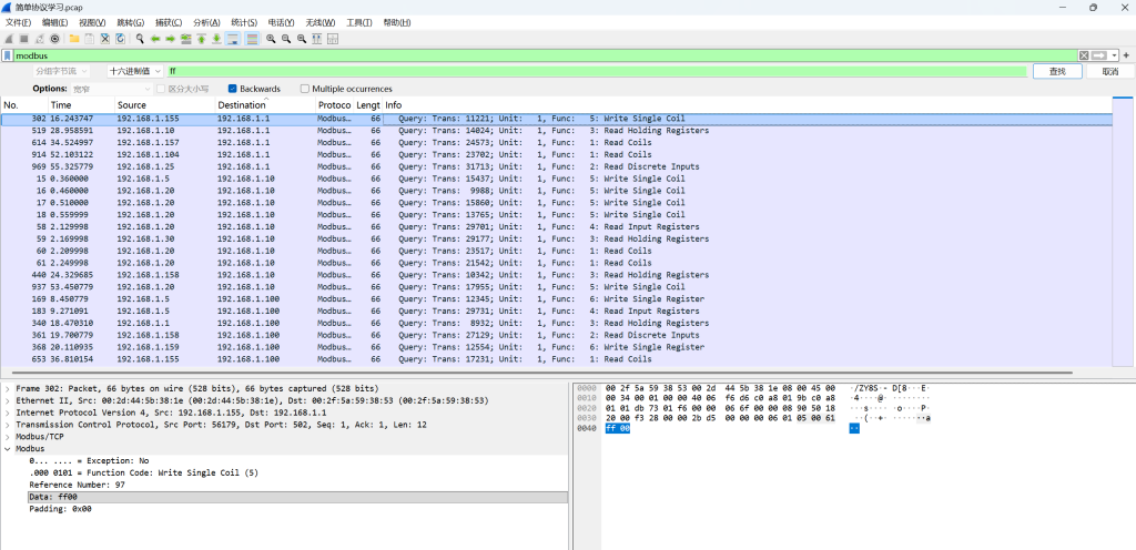 找modbus里面write single coil的含ff00(表示阀门on)流量