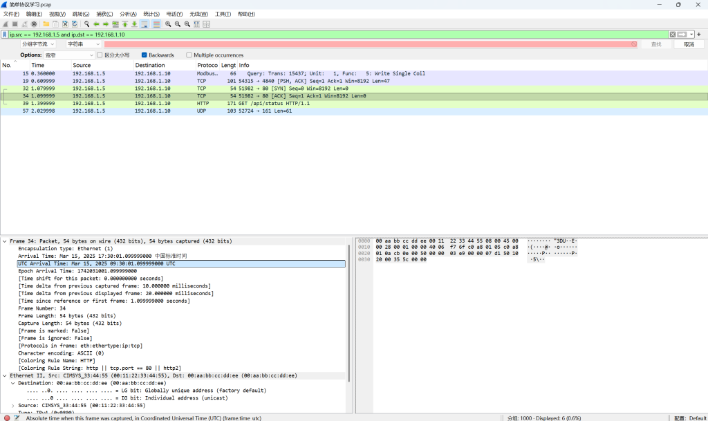 确定SCADA(源:192.168.1.5)到控制站(目的:192.168.1.10)上首个成功发起的时间点(UTC)。
