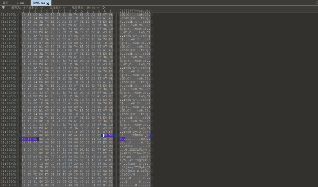首先给了JPG文件,我先尝试了foremost,发现文件末尾有两个89 50 4E 47 0D 0A 1A 0A结尾的PNG,先单独取出来,发现这两个图片是一样的,仅内容和大小,而且也没有盲水印。