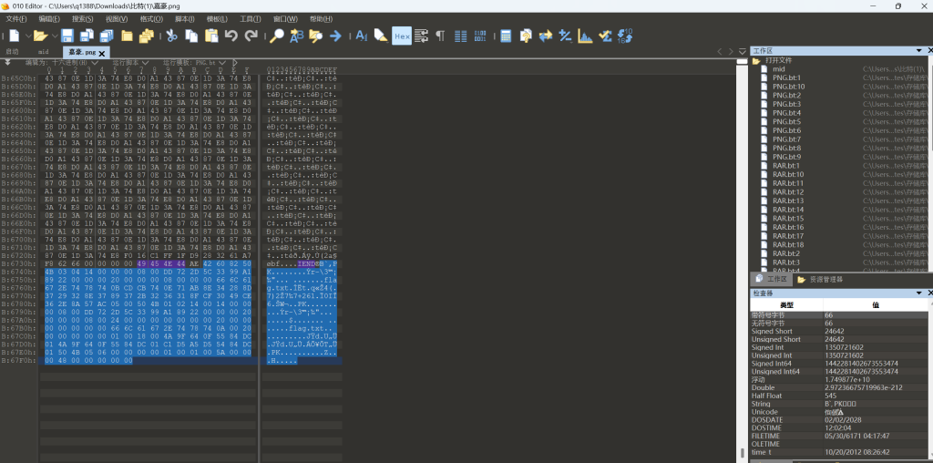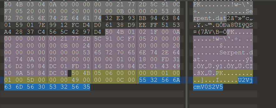先将mid的高四位的16进制数据粗略看下,每两个 nibble 组合成一个完整字节,发现组合起来是是50 4B 03 04,这是zip的文件头