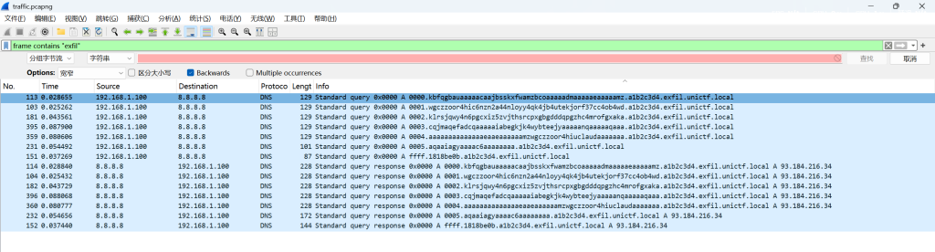 这份包不大(几十 KB),但直接扫 payload 并没有出现 `flag` / `CTF{` 这种直给的字符串,不过能看到一些 DNS 请求里带了 `unictf` 相关域名。这些是可疑的流量