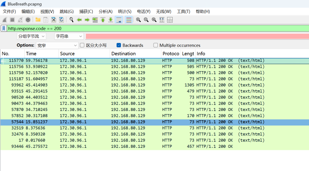 先初步看一遍,大量对 `172.30.96.1:8000` 的请求都在 404(像是目录扫描),但其中有少数返回 200