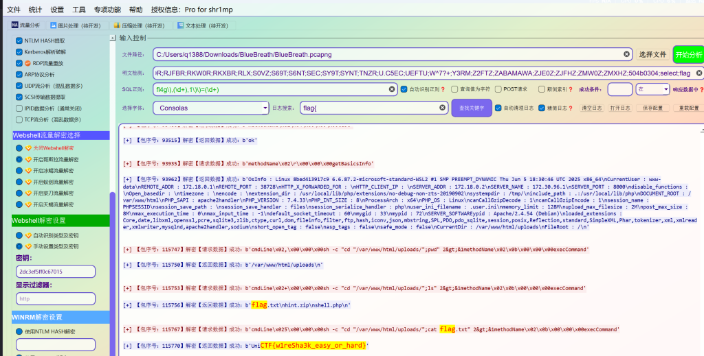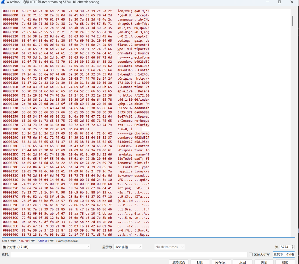 另外还能看到一次 OST /index.php`的 multipart 上传(文件名 `hint.zip`),里面有个hint.png。强行提取出来利用png文件头进行明文攻击