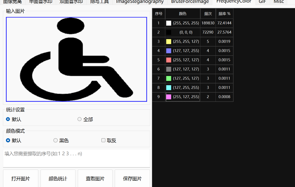 (注意到这里,图片人眼看到的只有黑色白色,而这些像素点又有别的颜色,而127是255的二进制储存第一位由1改为0.说明是LSB隐写的通道7:)