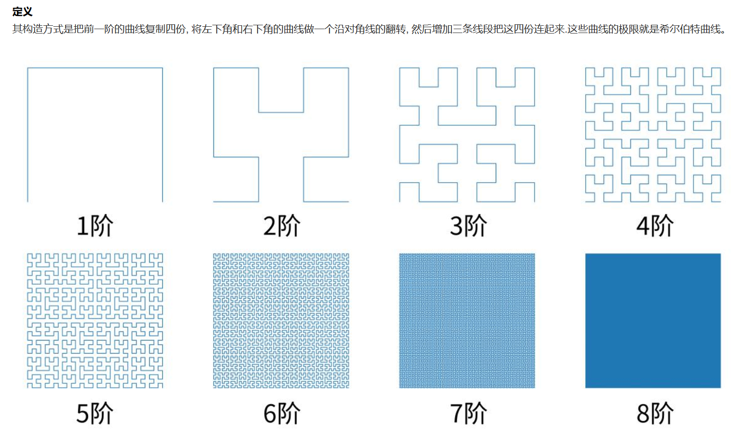 把之前每个子正方形继续四等分,每4个小的正方形先生成上一阶阶希尔伯特曲线;